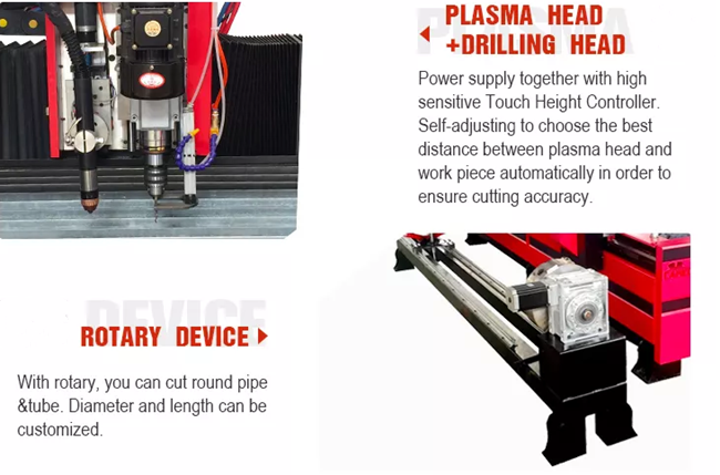 1. This CNC plasma cutting machine with plasma cutting head and drilling head ,with multi-functional,not only can cut steel iron plate and pipe,but also can drill and mark on steel. The machine with rotary device, can used for cut pipes ,tubes